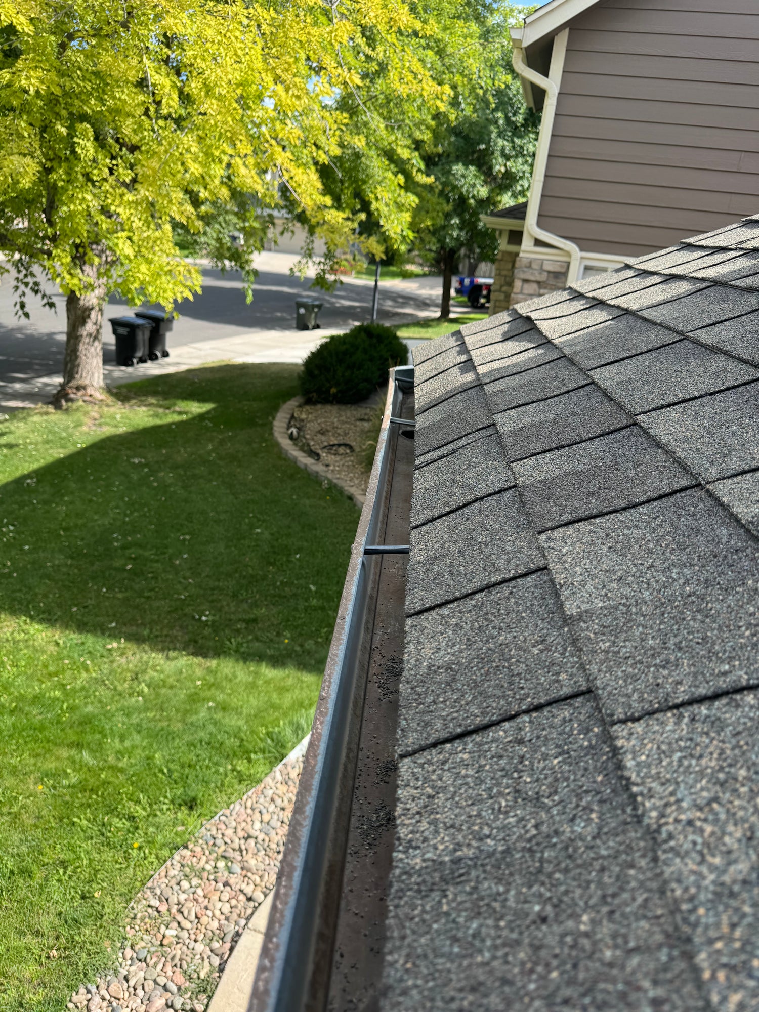We get up to the gutters and based off of how much debris there is in the gutter we either leaf blow everything out. Or we will go by hand and pick out all the debris and then bag it.